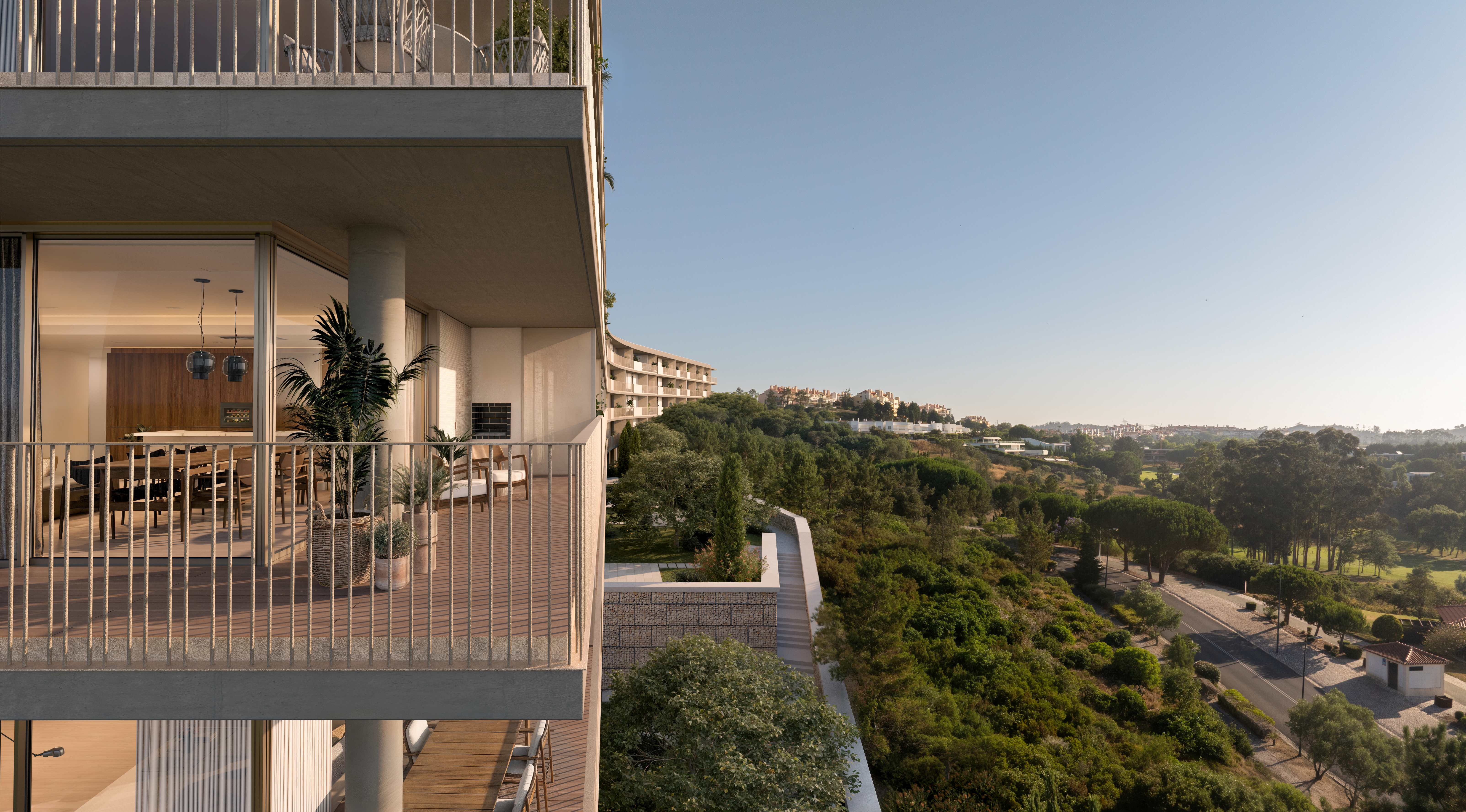 O empreendimento oferece vistas amplas, luz natural e um enquadramento de áreas verdes e com acesso rápido a Lisboa e à linha de Cascais, beneficiando de ligação aos principais eixos rodoviários e proximidade a serviços do próprio resort, como golfe, escola, restauração e conveniência.